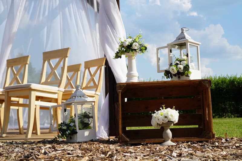 Esküvői esemény szabadban, virágos díszítéssel és DJ szolgáltatással.