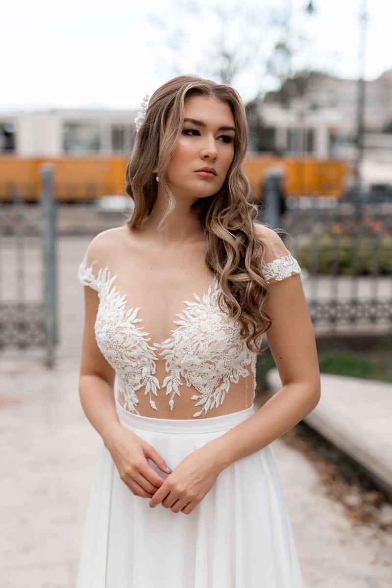 A kétrészes menyasszonyi ruhánál a felső és a szoknya külön darab, így variálhatóbb és kényelmesebb. A ceremóniára felveheted a hosszú szoknyát a csipkés felsővel, majd a buli alatt rövidebb verzióra cserélheted – egy ruha, két hangulat.