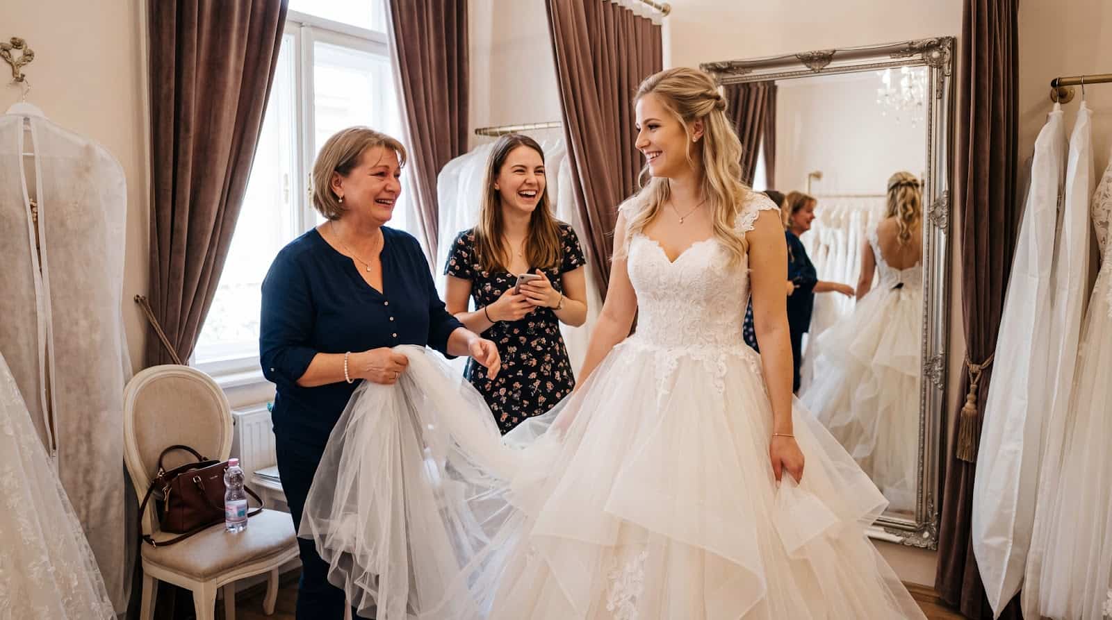 - Kísérő – vigyél magaddal maximum 1-2 embert. Az anyukád, a legjobb barátnőd, esetleg a tanúd. Ha az egész család beül az öltözőbe, abból sosem lesz jó döntés.