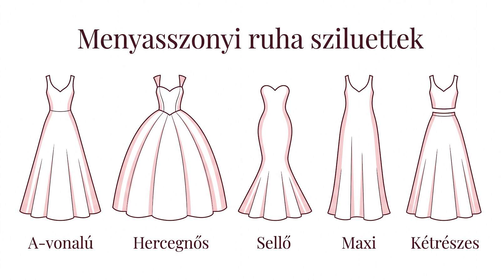 A menyasszonyi ruha kiválasztása mindig a sziluettnél kezdődik, ez a tökéletes ruha alapváza, és minden ezen áll vagy bukik. Mielőtt belevetnéd magad a csipkékbe és a flitterekbe, érdemes tisztázni, melyik forma emeli ki a legjobb vonalaidat. Itt a leggyakoribb fazonok, amik közül választhatsz a menyasszonyi ruhák palettájáról.